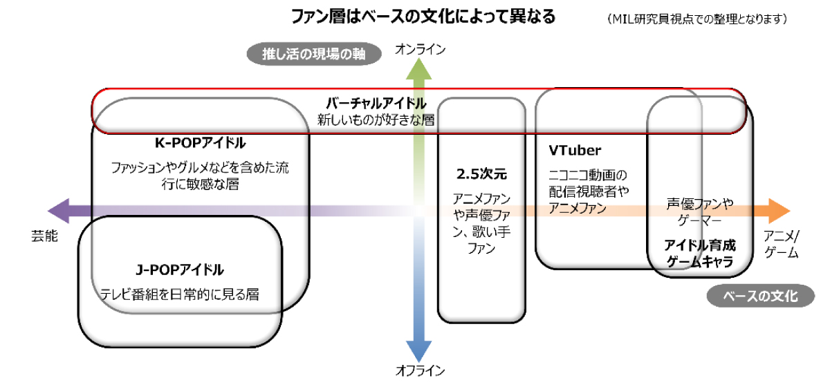 アイドルのDXは、推し活を行う層の広がりにも影響を与えています。というのも、オンラインでコンテンツが提供されることによって、学生なども無理なくファンであり続けることができますし、海外へもファンが広がりやすくなっているからです。またアバターによって多様な見た目がつくれるため、多種多様なアイドルが登場しており、それぞれのファン層が拡大しています。そもそも、バーチャルアイドルの見た目がアニメルックかフォトリアルかによってファン層は異なっています。もともとアニメなどの2次元カルチャーに触れてきた層とJ-POPやK-POPなど芸能ファンの層、それぞれの新しい物好きからファンになってきている状況です。私自身リアルアイドルを長いこと推しているのもありフォトリアルなバーチャルアイドルは調査前から気になっていました。一方で2次元カルチャーにも馴染みがありながら、いわゆる萌アニメ的なキャラデザインのVTuberしか知らず、あまり興味が湧かなかったんです。今回リサーチをするうちにさまざまなデザイン、見た目のアイドルがいることがわかり、そのうちの1人にいまはまっています(笑)。