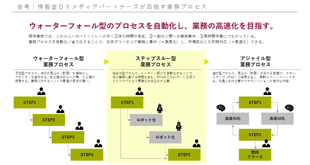 広告メディアビジネスは、かつての属人的な業務プロセスに、システム的な業務プロセスが融合しつつあるのが現状です。これまで多くの時間コストがかかっていたプロセスを自動化させることで初めて、メディアの価値向上や、得意先のマーケティングへの貢献など、社員が本来行うべき業務に集中できる環境を整えることができます。近い将来、社員とAIやロボットが自然と分業する世界をつくり出し、アジャイル型の業務プロセスを浸透させることができれば何よりです。