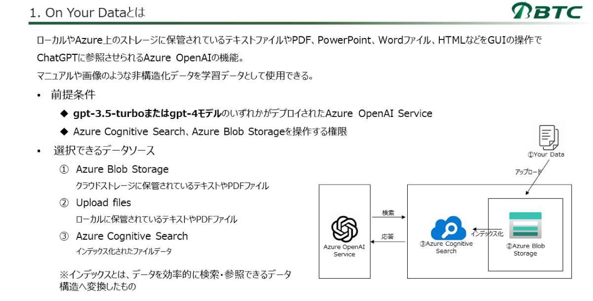 現在複数の仕組みのテストを並行して行っているところですが、一例としてBTC社と取り組んでいる、Azure OpenAI Service上のOn Your Data機能を使い、ChatGPTの回答に業務データを利用できる環境構築についてご紹介します。この機能を使えば、Azure Blob Storageの中に自分のPDFやテキストなどのファイルを入れるだけで、それらを学習データとして読み込ませることができます。それらはインデックス化され、Azure Cognitive Searchで検索させることで、データ参照元さえ整っていれば、どのようなソリューションがどれくらい成果改善に寄与してきたのかや、業種やKPI別などのノーム値など、どんな問合せにも自動で対応することができます。