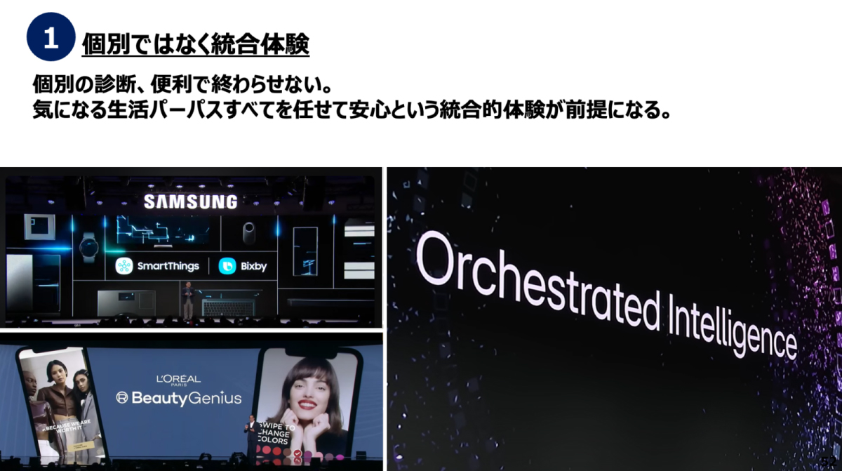 ロレアルは診断にとどまらない推奨から、トライ、購入までの統合的体験を打ち立て、SamsungやLGも家の中を統合的に心地よいものにしようとしていました。個別診断や瞬間的な便利さで終わらせず、AIの力を駆使して生活パーパス全体にアプローチすることが前提になるでしょう。