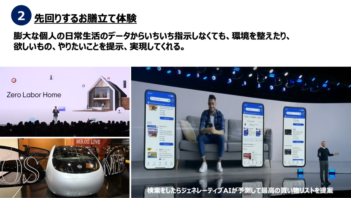 山本:家庭内のセンサーが体調を読み取りそこからAIが体調を心配して病院へアポイントを入れたり、1日の予定を調整したりするデモもありました。環境そのものがセンサーを持ち、AIとともにメディアやコミュニケーションの場となる。そんなふうにストレスなく生活が快適化する生活が、生成AIによって実現しようとしています。