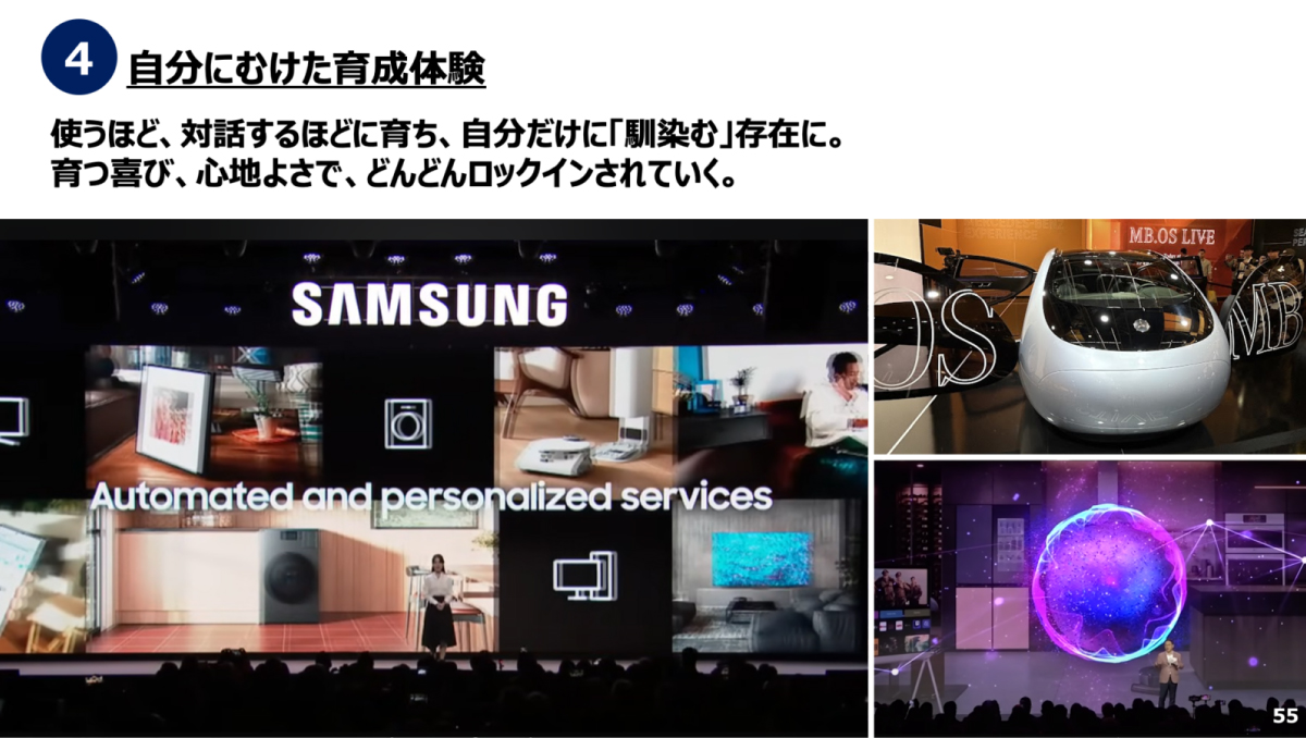 会話や生活を通じたデータを用いて、生活者に向けたパーソナライズが進むことも欠かせません。対話するほどAIや生活環境が育っていけば、その喜びと心地よさでその企業のサービスやインターフェースが手放せなくなっていく。そう感じてもらえる、自分に向けた育成体験が重要になっていきます。