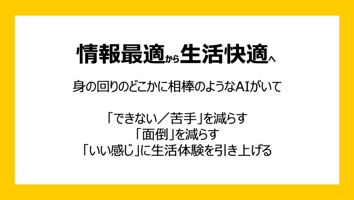 山本:ロレアルとウォルマートの事例から、AIがもたらす生活の変化として「情報最適から生活快適へ」という動きが見えてきます。情報のデジタル化が進み個人に最適化された情報生活はいま実現されつつあります。今後生活のデジタル化に移行する中で、身の回りにいる相棒のようなAIが苦手や面倒を減らし、生活を「いい感じ」に引き上げ整えてくれる時代が近づいているのです。