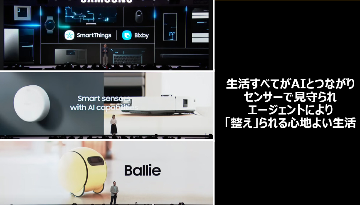 家での暮らしを変革する企業の一つがSamsungです。家電やスマートフォンなど様々な機器がすべてつながりAIとも連携。自動化・パーソナライズされた体験が家庭内に提供されることをプレゼンテーションしました。AIとつながったセンサーが家の中を見守ることで、いつもの生活習慣を学習。もし誰かが倒れていたりしたら、すぐに伝えてくれるといいます。