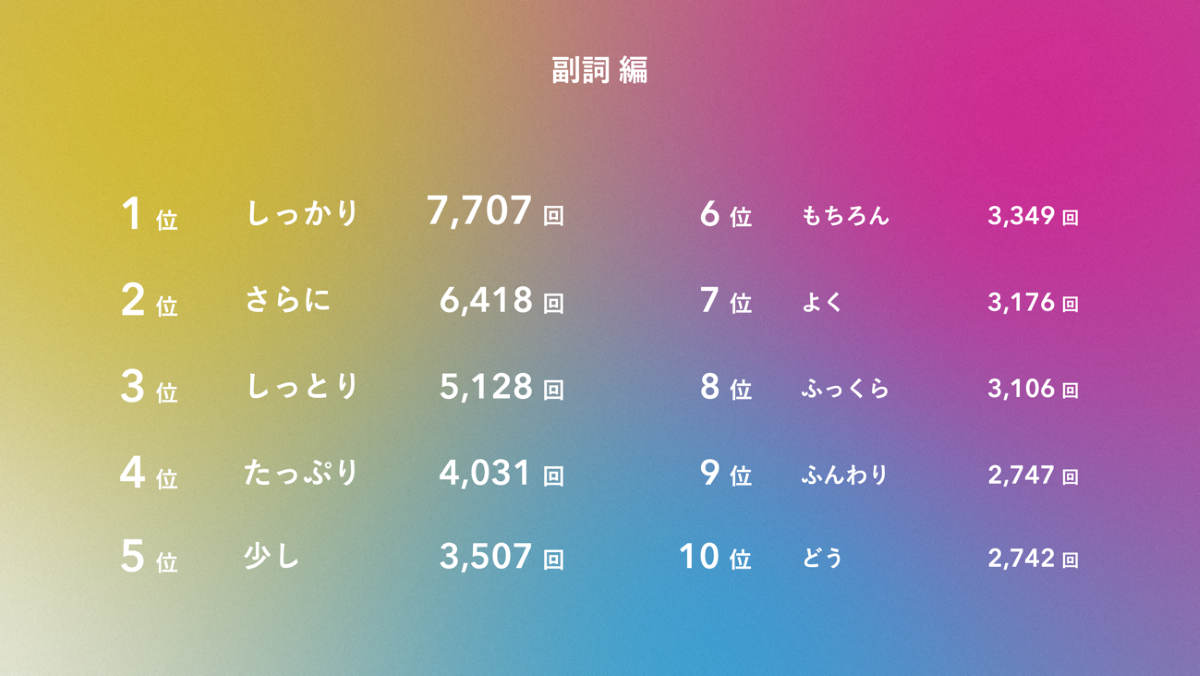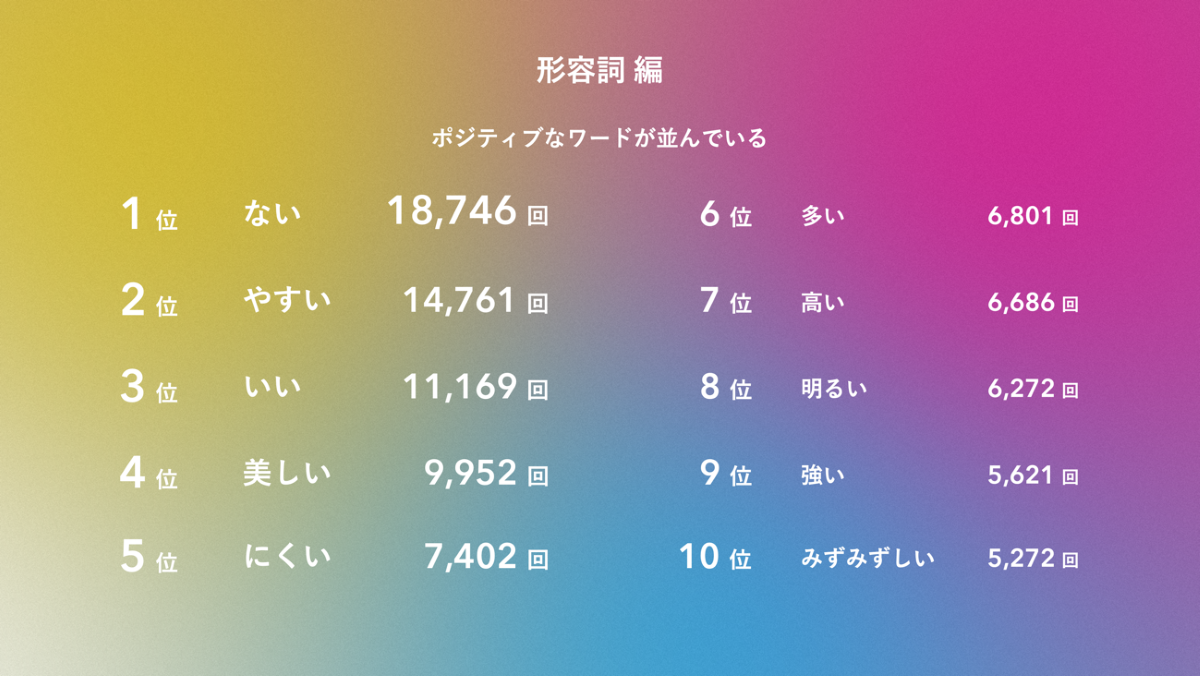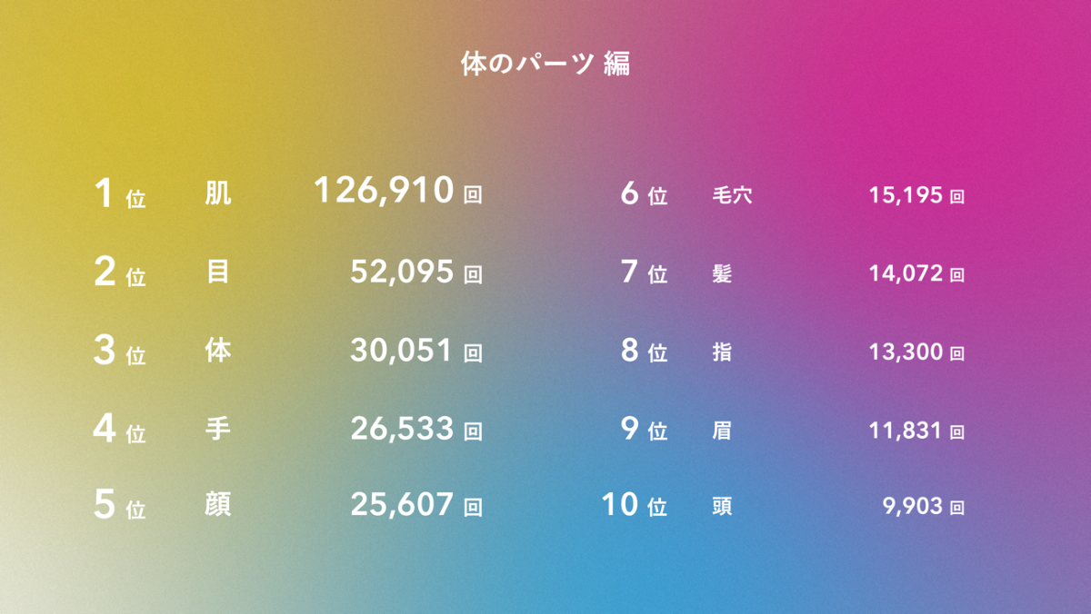 ここでは自然言語処理で用いられる形態素解析や固有表現抽出という手法を用いて、人物名、組織名、製品名などをディープラーニングによって抽出し、「体のパーツ」「形容詞」「副詞」といった観点でワードを集計しました。どういう体のパーツがフィーチャーされているかを見ると、圧倒的1位が「肌」で、約12万回。2位が「目」で5万回、3位が「体」、4位が「手」、5位が「顔」といった順位でした。次に、形容詞に着目し、上位ワードの「ない」「やすい」「にくい」の前にどんな言葉が使われていたのかを見てみると、「負けない」「ベタつかない」「目立たない」、「続きやすい」「塗りやすい」「取り入れやすい」、「落ちにくい」「揺らぎにくい」「崩れにくい」など、化粧品を使ううえでの表現が多いことがわかります。次に副詞に注目すると、1位は「しっかり」2位は「さらに」3位は「しっとり」4位は「たっぷり」などが多く、同様にどういうワードとセットになっているかを見ると、「しっかり発色」「しっかり潤う」、「さらに進化」「さらに効果的」など、美容化粧品の使い方やどういう効果があるかという表現が多用されていることがわかりました。