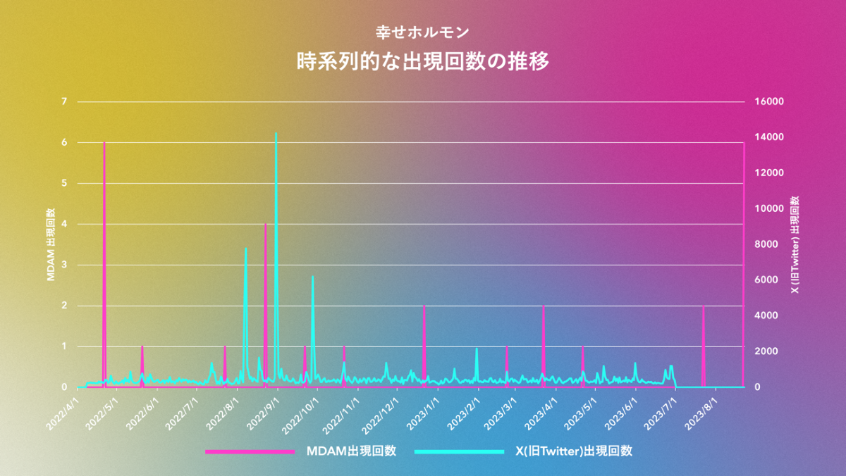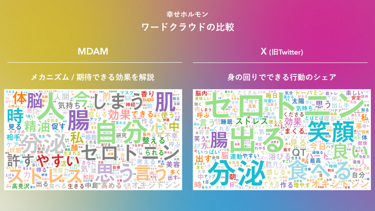 雑誌とX(旧ツイッター)で分析してみると、雑誌で取り上げられた直後にXでバズっていることや、同時期に盛り上がっていることもあり、雑誌での発信を受けて盛り上がっていることがうかがえます。それぞれのワードクラウドを比較してみると、雑誌では「分泌される」とか「ストレスにいい」とか、「セロトニン」、「メカニズム」など、主にその効果の解説が主なのに対し、Xでは、たとえば笑顔をつくったほうがいいとかこれを食べた方がいいとか、身近でできる行動のシェアがよくなされています。