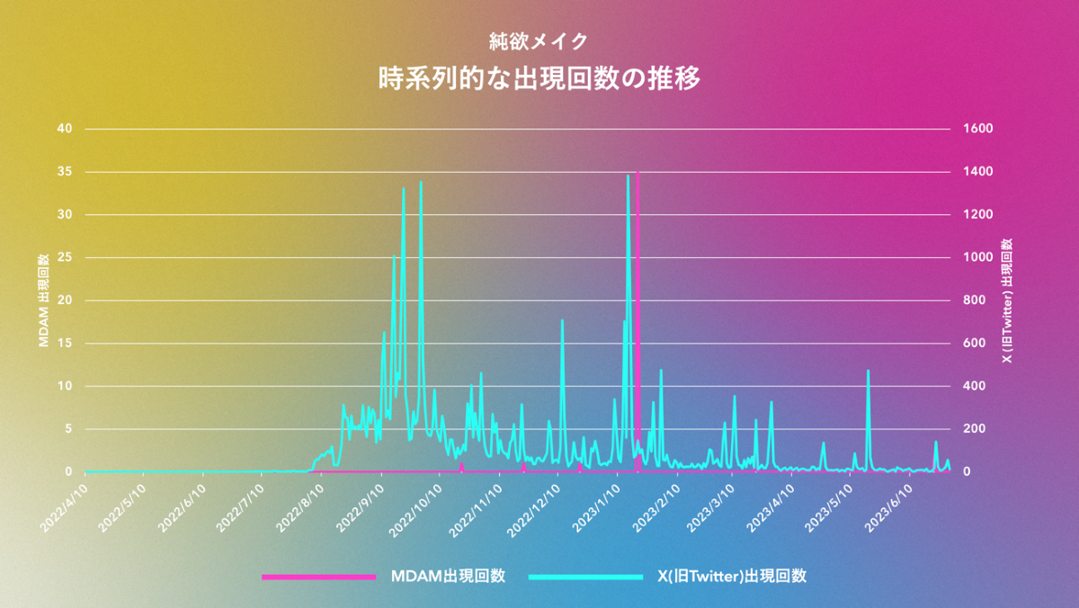 雑誌で取り上げられた後にある程度リツイート(リポスト)されており、雑誌で取り上げられたことによって再びSNSでもさらに話題になったことがうかがえます。「令嬢メイク」も、雑誌で取り上げられた後にSNSで再度盛り上がっていました。「角栓崩壊」については、雑誌では以前から取り上げられていましたが、SNSでバズった後に再度、雑誌で取り上げられたという推移になっていました。