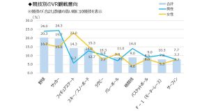 競技ごとにVR観戦意向を聞いてみました。調査で提示した59競技のいずれかを観戦したいと答えた人は5割以上となりました。個別競技別では、野球、サッカー、フィギュアスケート、スキー/スノーボードなどが上位で、フィギュアスケートでは女性が特に高くなりました。そもそものコアファンの影響もあるかもしれません。