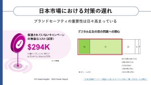一方、日本では関心自体は高いものの、具体的に対策を取っているかというと、海外市場に比べると後れを取っている状況があります。DoubleVerify の調査「DV Global Insights : 2024 Trends Report」によると、「ブランドセーフティの対策ツールを導入しない場合の広告キャンペーンでは、10億インプレッションあたり29万4,000ドル、約4,200万円のコストが無駄になることが分かりました」と武田氏。