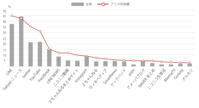 図5 毎日利用サービスの利用率比較(アニメ利用層TOP20)