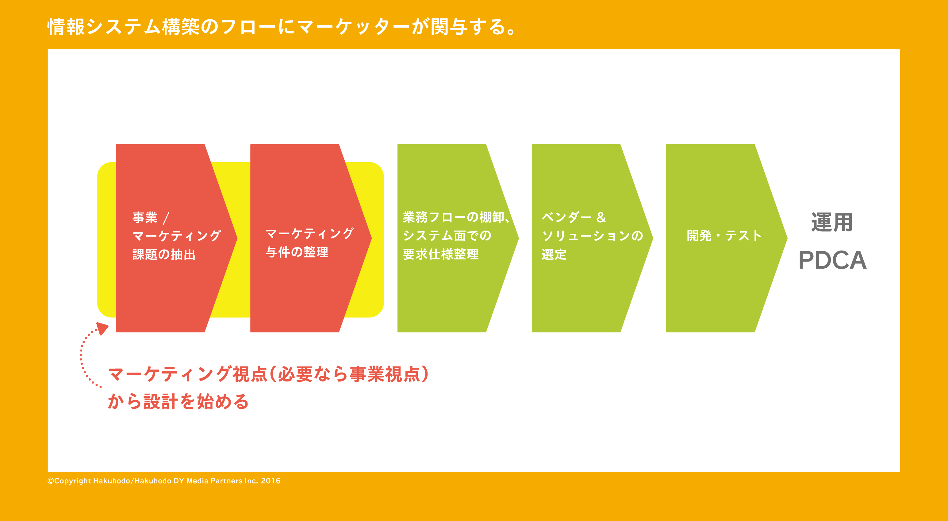 そこでマーケッターも、システム構築の世界でいう、[要件定義→設計→開発→テスト→カットオーバー]というプロセスのうち、少なくとも「要件定義」のフェーズでは、明確なマーケティング視点・狙いをもって「マーケティング要件定義」とでもいうべき深い関与をした上で、「システム要件定義」に引き渡しておくことが必要になります。でなければ結局、データをいちいち取り出して○営業日かかる、保守ベンダーに○○万円都度払う、あれがないこれがない・・・という本末転倒なことになりかねません。
