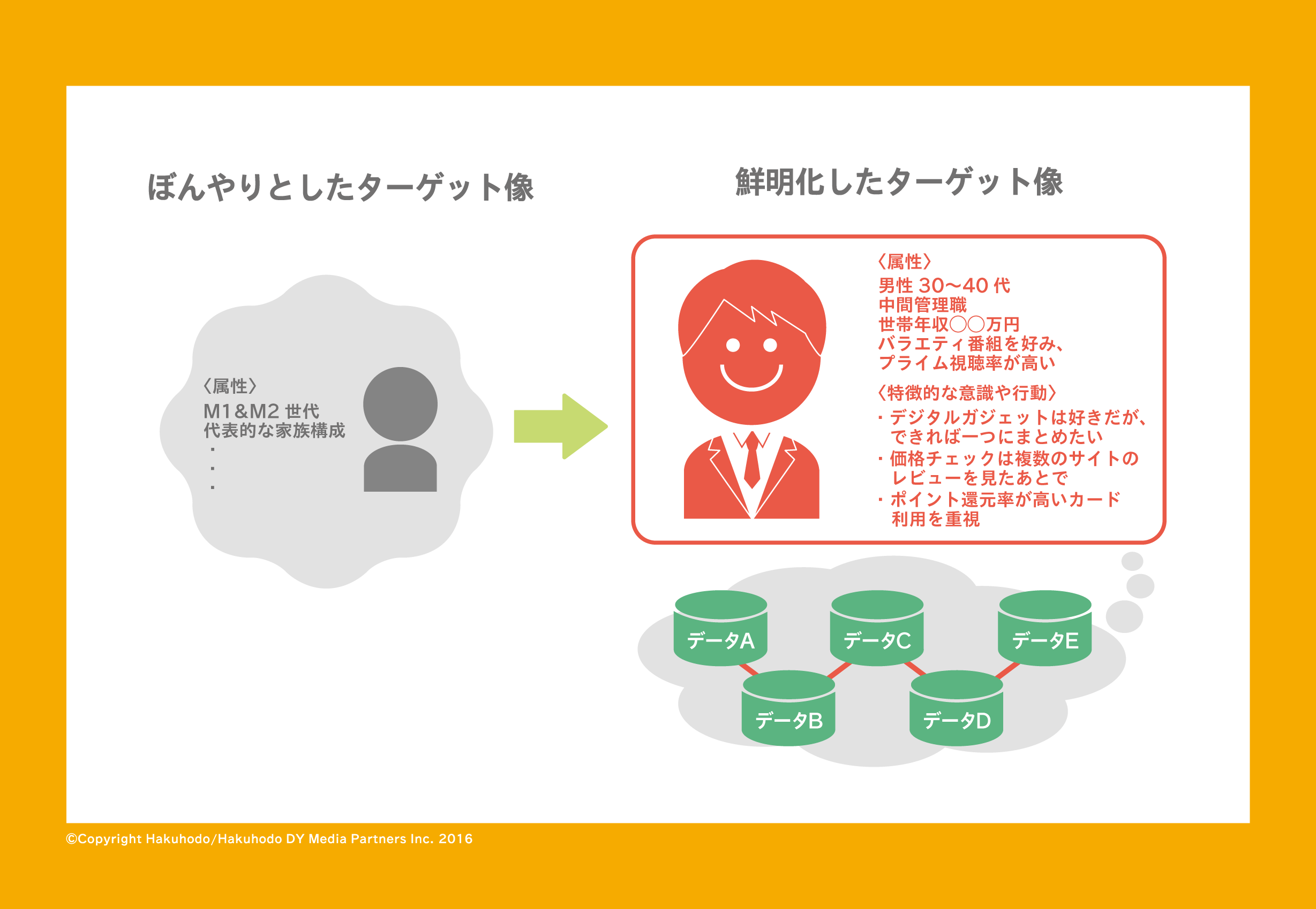 ハイレゾに対応したスマホの新製品情報を普段からWeb検索でよくチェックしていた人がいち早くリリース情報をニュースサイトでキャッチして、最終的には競合X社の専用プレーヤーと比べた結果購入に至っており、対応ヘッドホンとの同時購入率も高い。世代的には30代前後の男性が多く、プライバシー情報に普段からとりわけ敏感。また、買った人には大きく2タイプいて、もう1つのパターンは全く違う情報行動をとるBタイプがあり、こちらも○○万人いる。数こそ少ないが、購入ポテンシャルはむしろ高い。