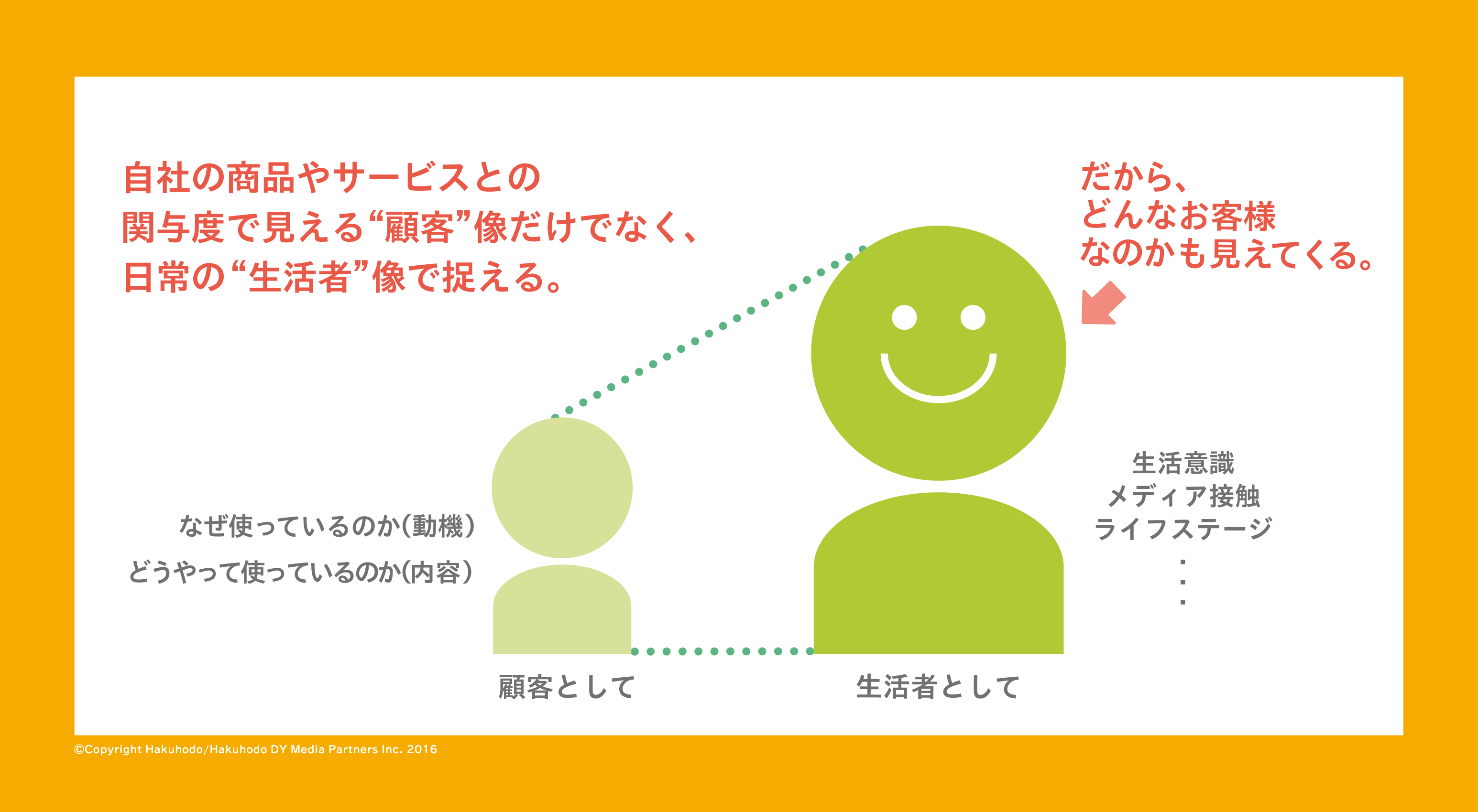 シングルソース化された、様々な視点からなるデータを眺めることで、顧客としての側面だけでなく、日常を送る一人の生活者としてそのお客様を捉える。そこからあらためて商品/サービスや企業との接点を考え、生々しい”像”を思い描く。(前回のコラム参照 )そうすると、その人とはどこでどう接点を持ち、関心を持ってもらうことが良い結果につながるのか、そのヒントが見えてきます。