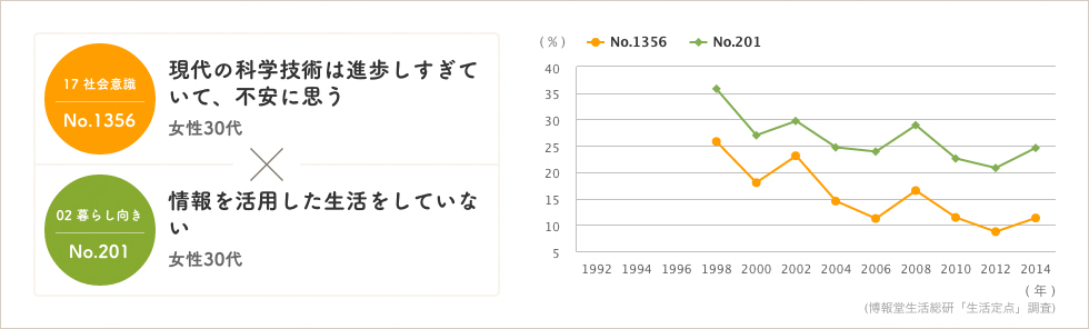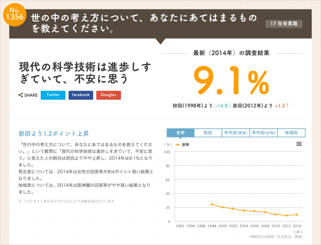 ということは「科学技術が進歩しすぎた不安」とは、女性30代にとっては「情報爆発によって、情報活用が追いついていない不安」であり、男性30代にとっては「(システマティックな技術、仕組みに対するアンチとしての)個人生活の充実に対する飢餓感としての不安」ということでしょうか。