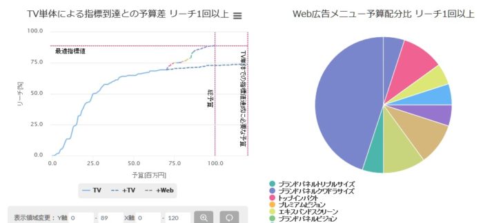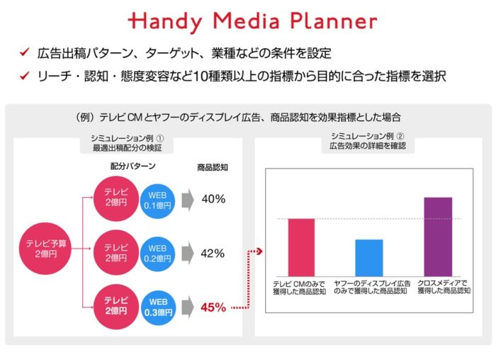 次に「Handy Media Planner」についてですが、テレビCM と PC・モバイルのインターネット広告を組み合わせた最適な出稿パターンを提示することが可能なクロスメディア・プラニング・ツールです。「Handy Media Planner」には、先ほどの「Yahoo!メディアオーディエンスパネル」の広告接触データと、複数業種を対象に実施したテレビCMおよびインターネット広告の広告効果データが活用されています。リーチや認知、態度変容など複数の指標に応じて、テレビCMとインターネット広告の広告効果を最大化する最適出稿配分を算出します。また、広告効果の詳細(同一予算において、テレビCM単体での場合と、テレビCMとインターネット広告を組み合わせた場合での広告効果の比較など)を検証することも可能です。