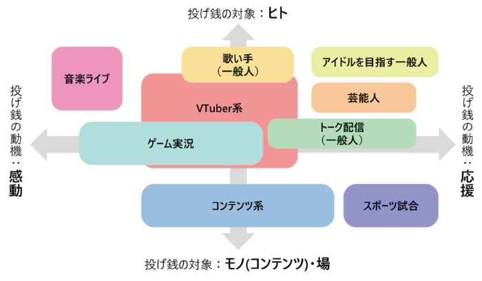 ――投げ銭を取り入れた各プラットフォームにはどんなプレーヤーがいて、どういった動向が見られますか。ジャンル別に教えてください。