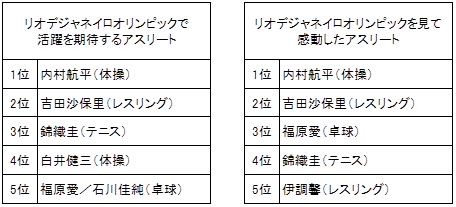 事前の「リオデジャネイロオリンピックで活躍を期待するアスリート」では1位:内村航平(体操)、2位:吉田沙保里(レスリング)、3位:錦織圭(テニス)、4位:白井健三(体操)、5位:福原愛/石川佳純(卓球)となりました。