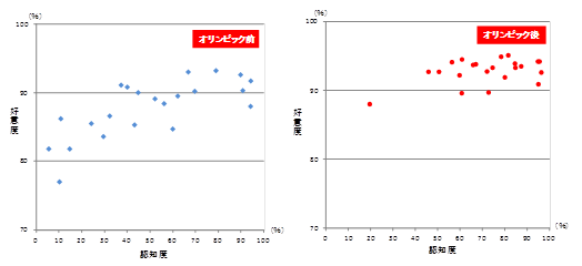 アスリートの認知度をX軸、好意度をY軸に置き、事前(左図)と事後(右図)でプロットしてみました。これを見ると認知度、好意度ともに事前よりも事後でプラス方向に働いています。