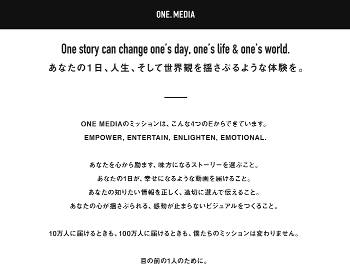 疋田 ただ、メディア事業部としてのミッションやビジョンは一貫しています。“あなたの”という言葉をよく用いるのですが、「目の前の一人ひとりのために」というメッセージですね。今後としても、一人ひとりとの対話をよりインタラクティブにしきたいと思っています。というのも、ONE MEDIAの動画に対しての熱心なコメントやDM(ダイレクト・メッセージ)が多いんです。