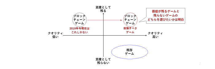 既存のゲームは遊んだあとに、価値として残るものは何もありません。価値が残らないものと、価値が残るもののどちらが選ばれるかは明白です。ブロックチェーンゲームのクオリティは、現状ではまだまだ低いのですが、時間とともにクオリティは上がり、近い将来、市場が入れ替わるのではと考えています。