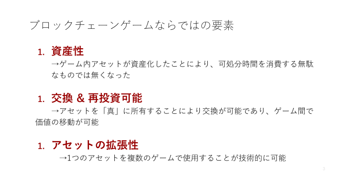 既存ゲームからブロックチェーンゲームへの移行が行われると言いましたが、ではどんな要素を持ったゲームが流行るのでしょうか。ブロックチェーンゲームのような新しいゲーム領域が誕生すると、そのゲーム領域でしかできない体験を持つものが受け入れられていくと思います。実際、ソーシャルゲームではスマホならではの動きや体験のあるものが急成長した経緯があります。なので、ブロックチェ-ンゲームならではの要素を持つものが勝ち残っていくと考えると、「資産性」「交換&再投資可能」「アセット拡張性」の3つの要素があると考えています。