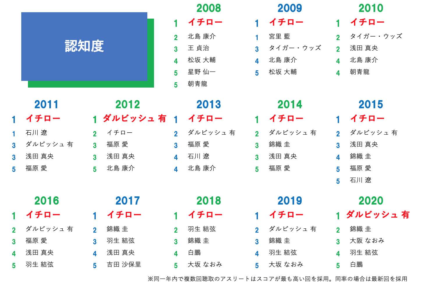 まずは、アスリートの認知度について見ていきましょう。2008年からイチロー選手が1位になったのは11回。圧倒的な認知度の高さを見せています。メジャーリーグといった世界各国からの一流選手が競う試合での活躍が、日本国内でも多く報道され、認知度にも大きく影響したと考えられます。また、メジャーリーグが毎年定期的に行われるレギュラーシーズンということも多くのメディア露出量をつくりだしていたのではと思います。イチロー選手引退後、2020年では同じくメジャーリーグでサイヤング賞候補となったダルビッシュ有選手が1位となっています。