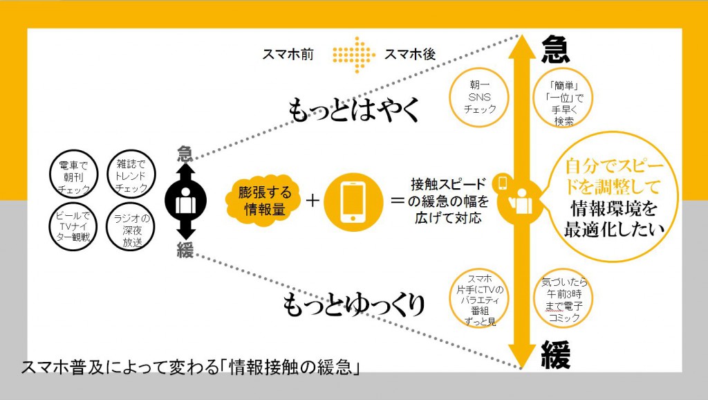 情報の見方でいうと、接触の緩急を図るようになっていると思います。スマホ以前にも雑誌で手早くトレンドチェックするといったことはあったのですが、情報量が毎年、何10倍という勢いで急激に増えるなか、スマホの本格普及によって、情報接触の緩急の幅が広がっています。朝起きてすぐSNSをチェックするなど、非常にファストな情報接触のしかたがある。一方で、電子コミックなどのアクセスピークは夜間で、寛ぎながらゆっくりとコンテンツに接触している。こま切れに手早く見ていくか、ゆっくり見るか。この幅が私たちの想像よりもはるかに拡大してきています。緩急のどのタイミングに情報を投げるのかを強く意識していかないと、単純な電子化では、なかなか消費者の気持ちに刺さらない状態になっています。