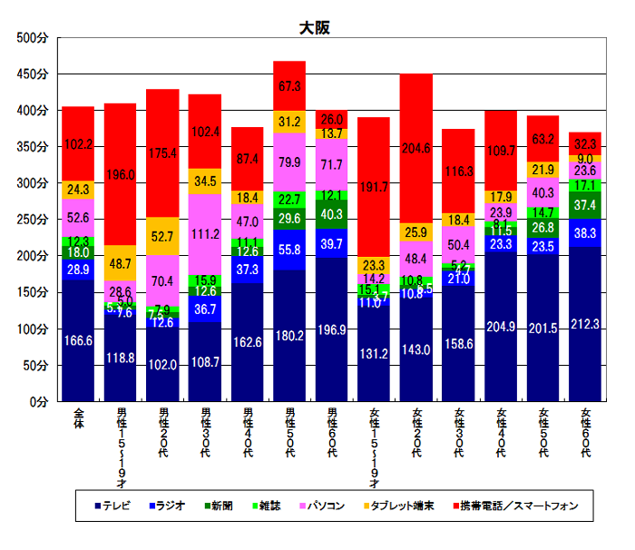 【図1-2】メディア総接触時間 性年代別(大阪)