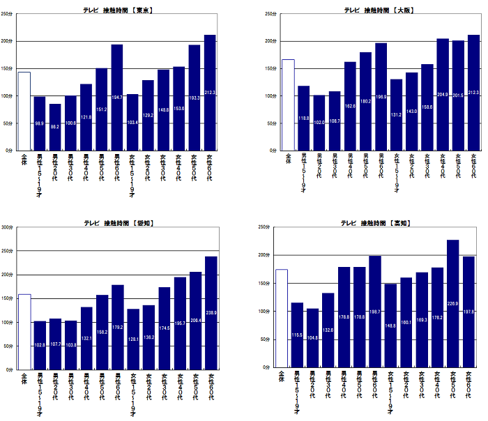 メディア総接触時間の4地区(東京・大阪・愛知・高知)の性年代別グラフを眺めてみると、どのグラフも同じような形を描いていることに気が付く[図1]。