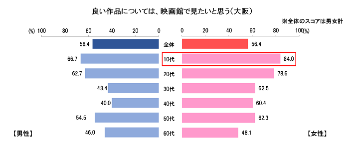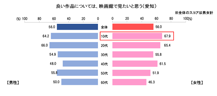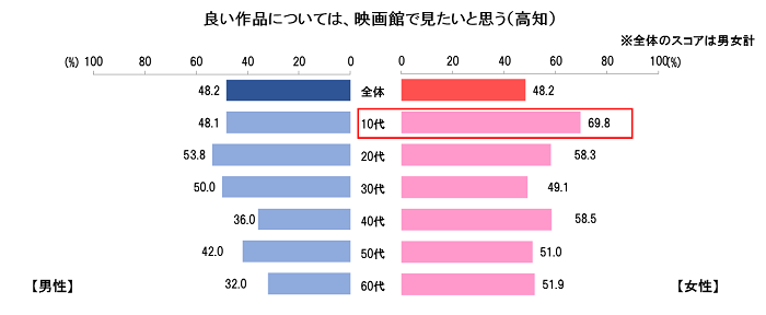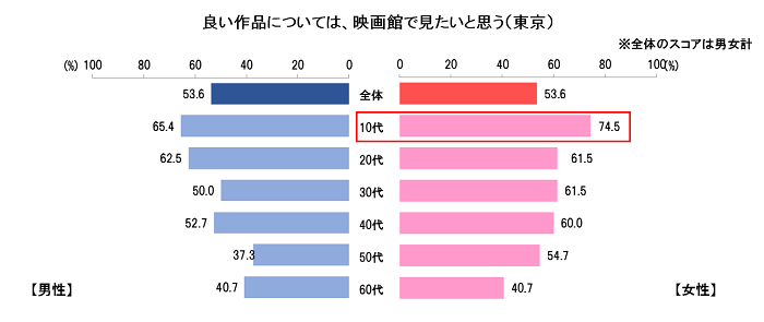 家族全員で一台のテレビを囲む団欒風景を懐かしむ気持ちもないではないが、思い思いに楽しむことができる映像空間が家の中にいくつもあることは、贅沢で豊かな風景である。自宅での豊かな映像視聴は、「良い作品については、映画館で見たいと思う」気持ちを掻き立てるのではないだろうか。そして、スマホで手軽に映像を楽しむことがあたりまえになったいま、その気持ちが一層高まっていることは想像に難くない。スマホネイティブの10代女子がどの年代よりも「良い作品については、映画館で見たいと思う」気持ちが高いというメディア定点の結果を見ながら、そんなことを考えている。
