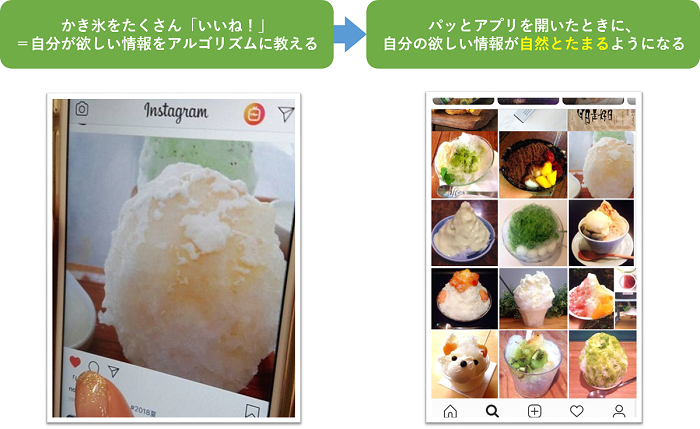 「私は、かき氷に興味があって、その最新情報を効率的に集めるためにやっていることがあります。インスタグラムで投稿されているかき氷の画像をとにかくたくさん“いいね”するんです!するとフィードに自然に集まってくるようになるんです。」