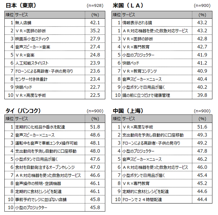 日本は唯一「無人店舗」が1位になっています。他国では、10位以内にも入っていないサービスでした。米国はAR/VRへの関心が高く、「情報表示される鏡」と「AR対応機器を使った救急対応サービス」が同率1位、「VR×医師の診断」が3位、「VR×専門教育」が4位にランクインしており、4位までにAR/VRが3項目入っています。まず、初めてこのランキングデータを見てどう感じられましたか?