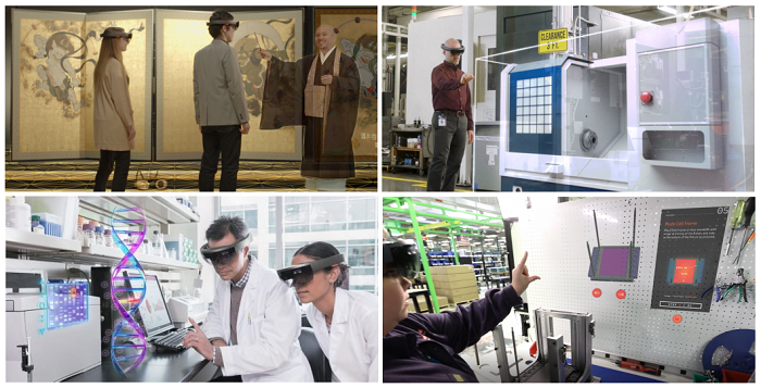 左上:hakuhodo-VRARがプロデュースしたMRミュージアムin京都、右上:遠隔サポートとマイクロソフトレイアウト、左下:医療、右下:製造