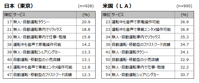 通勤が車という話がでましたが、米国のデータ(図2)を見ていると、「無人・自動運転タクシー」が41位(日本は17位)、「無人・自動運転シェアリングカー」が54位(日本は39位)など、自動運転に対して消極的なように見受けられます。通勤に毎日車を利用していたら、こちらがもっと上位にランクインしていてもよいのかなと思うのですが。