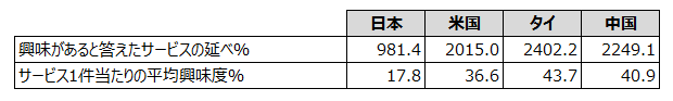 そうですね。こちら(図3)は「興味がある」と答えた55のサービスの%を足しあげたものなのですが、米国の興味の総量は2015.0。日本は981.4なので、米国の半分しかありません。