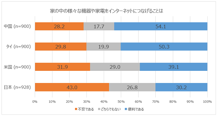 米国は改善された後の生活が違うというお話、また、スマートスピーカーが米国で普及しているというお話もありました。今回の調査では、情報提供とセキュリティに関連する質問もきいています。「家の中のさまざまな機器や家電をインターネットにつなげることは」(図4)について、日本では不安と答える人が、便利と答える人を上回りました。他国では便利と回答する人の方が多いのですが、こちらについてはどうお考えですか?