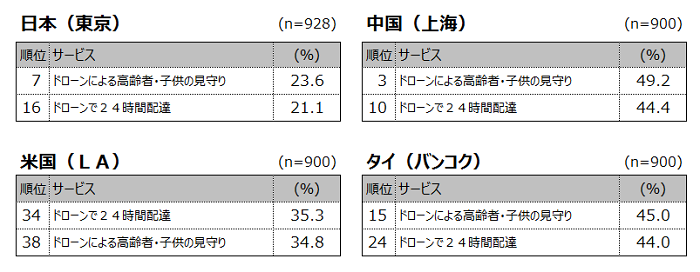 そもそもの国民性が結構違うのですね。次に、ランキングで中国の特徴としてVR/AR/ドローンに関する項目が10位以内に6件ランクインしています。特にドローンに関しては、10位以内に2件ともランクインしているのは中国だけです(図2)。上海蟹がドローンで配送されていたとニュースもありましたが、実際にドローンは中国でどの程度普及しているのでしょうか?