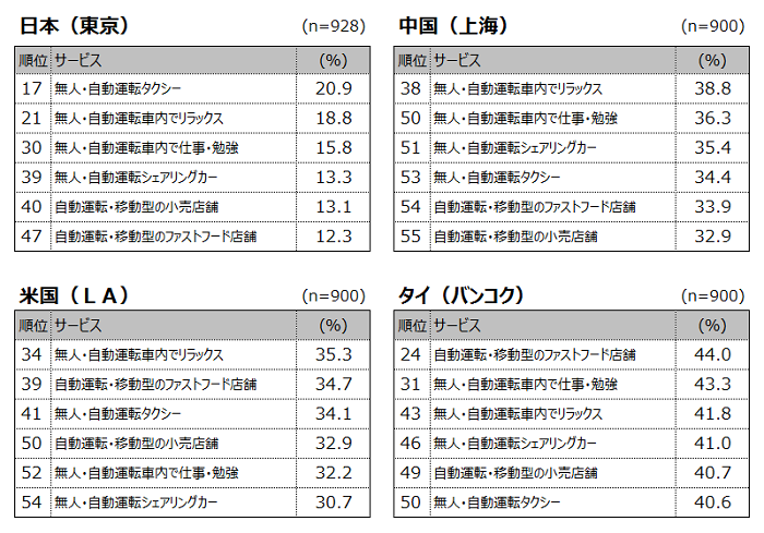 NIOは、中国版テスラといわれている車ですね。ところで、中国は、運転支援系のサービスが下位に集中していて、「無人・自動運転車内でリラックス」という項目を除いてすべて50位以下となっています(図3)。自動運転には全く期待されてない感じがするのですが、何か理由があるのでしょうか?