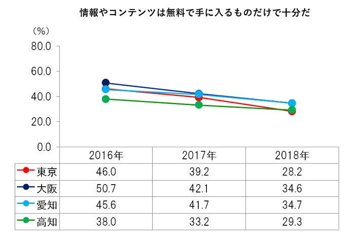 しかし玉石混淆の情報が溢れる現在、情報の真贋を見分ける目を養い始めたことはメディアにとってのチャンスになりうる。「情報やコンテンツは無料で手に入るものだけで十分だ」がいずれの地域でも年々減少していることが示すように、生活者は自分にとって価値ある情報に対価を払うのはあたりまえだと思い始めているようだ【図2】。