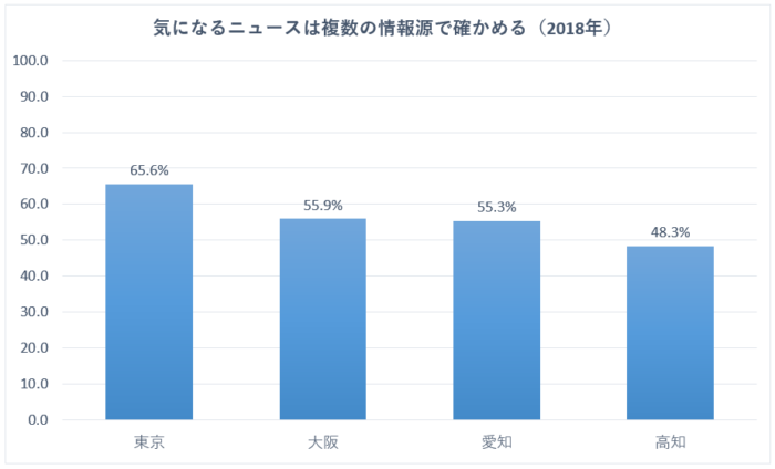 まず「気になるニュースは複数の情報源で確かめる」を見てみよう。東京では約7割(65.5%)、大阪・愛知では約6割(大阪55.9%、愛知55.3%)、高知でも半数近くが(48.3%)「気になるニュースは複数の情報源で確かめる」と答えている【図1】。