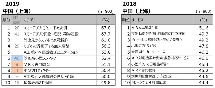 2018年と2019年のランクインしている項目を見てみると、今年は1位「スマホアプリ・QRコード決済」、2位「スマホアプリで買物・宅配・荷物運搬」、3位「外出先からスマホで家電操作」でした。これは、各国共通の今年の傾向なのですが、スマホで享受できる生活に注目が集まっています。グローバルでスマホの中にリアルな生活が結びついてきたのではないかと思います。昨年はこのように各国共通で10位以内に入っている項目はなかったのですが、中国では、このあたりいかがでしょうか。昨年、一番スマホアプリが発展していたのは中国かと思うのですが、ランキングがこのように変わった背景は何かあるのでしょうか?