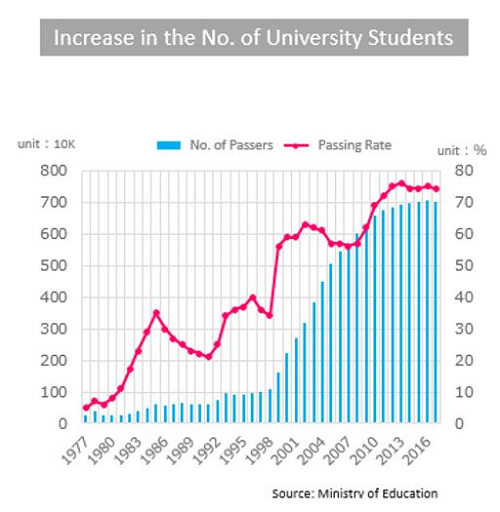 教育に関していうと、中国では教育は投資と考える人が多いです。大学生の数もここ20年間で7倍以上になりました(図3)。しかし、これだけのスピードなので、教育リソースが全体的に追いついていないです。例えば上海ではよい公立学校に子どもを入れるのはとても大変なことです。第一条件として近くに住んでいなければなりません。しかも、直前に引っ越したのではだめで、入学の五年前から住まなければいけません。そこで、よい学校の通学エリア内の不動産が人気を集めているのですが、「学区房」と呼ばれ、30平米の部屋が1000万元程で販売されています。