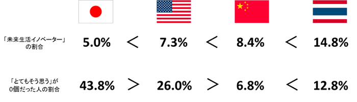 それでは、次に「未来生活イノベーター」についてお話を伺っていきたいと思います。「未来生活イノベーター」とは、「科学技術は人間の生活や社会にとって重要なものだ」や「常に新しいテクノロジーを使った商品やサービスを取り入れたいと思っている」など16の意識項目の内、12項目以上について「とてもそう思う」と回答した、イノベーションに対する需要の高い層のことです。各国で抽出したこの需要の高い人たちのことをメ環研で「未来生活イノベーター」と名付けたのですが、この層に着目することで、各国の「次の生活」潮流が見えてくるのではないかと考えています。