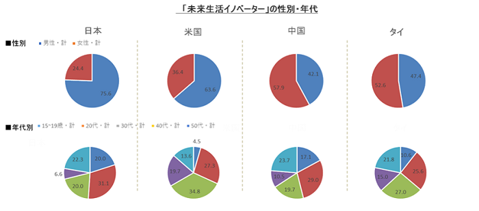 なるほど。成長を続ける中国ならではの悩みですね。では、「未来生活イノベーター」について男女別と年代別で見てみたいと思うのですが、中国は女性の方が多い結果となっています(図5)。これは日米とは異なる結果です。また、年代別で見ると、日本と似たような配分となっている気がします。米国やタイに比べると10代、20代の割合が多いように感じますが、いかがでしょうか?