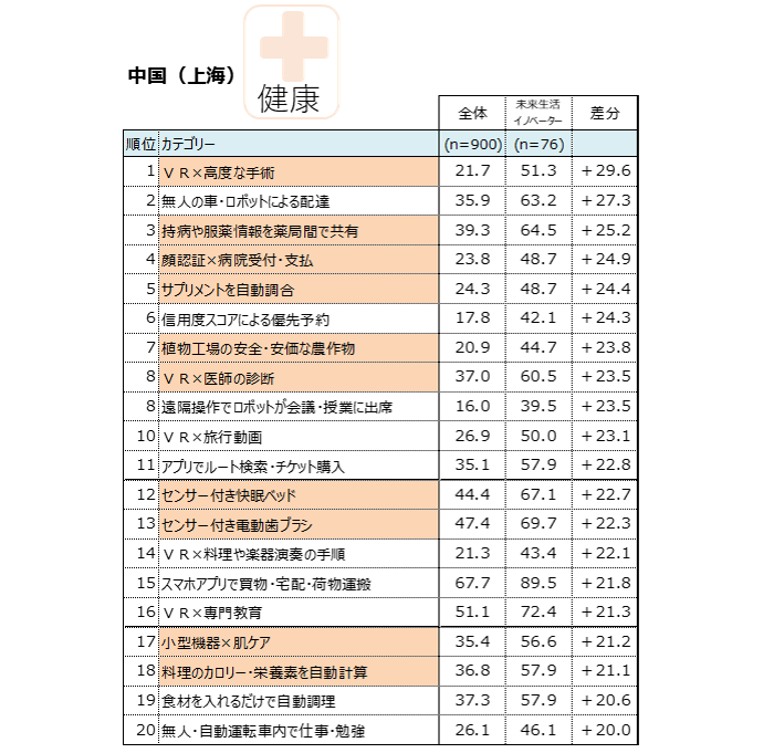 中国の若い世代は勢いがありますね。まだまださまざまな成長が生まれそうな気がしますが、各国の「未来生活イノベーター」を見ることで、各国ごとの「次の生活」潮流が見えてきます。中国は「健康」の領域から生活の在り方が変わっていきそうだという結果が出ました(図6)。こちらに回答者全体と「未来生活イノベーター」の興味度の差分をランキングにしたものがあるのですが、中国は1位「VR×高度な手術」、3位「持病や服薬情報を薬局間で共有」4位「顔認証×病院受付・支払い」など、医療に関する項目に加え、13位「センサー付き電動歯ブラシ」17位「小型機器×肌ケア」などもう少し広い意味でヘルスケアや美容に関する項目もランクインしています。この結果についての見解をお聞かせ願えますか?