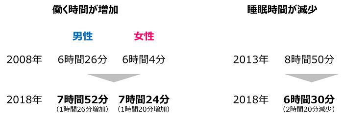 そうですね、こちらの数字(図7)を見ていただきたいのですが、中国の生活の豊かさが上がると共に、働く時間が10年間で約1.5時間増加しています。また、スマホなどの影響で、睡眠時間も5年間で約2.5時間減少していることがわかります。こういったことからも、中国人は以前よりも疲れている状態にあるといえます。その結果、健康面への関心が高まっている可能性があります。