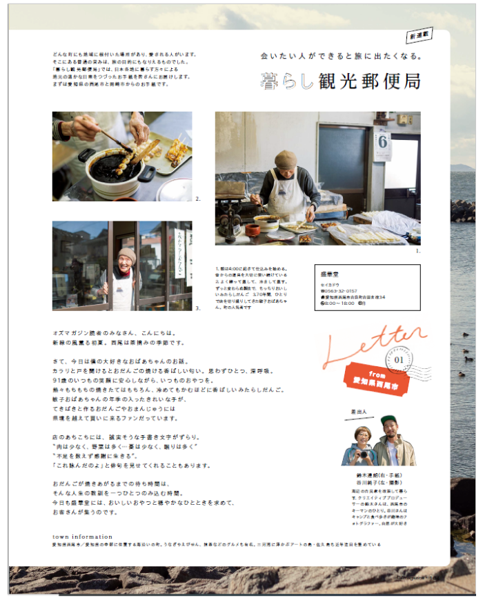 誰もが知るような観光地ではない、日本の小さな、もしかしたら名前も知られていないような街を少しずつ紹介していくという新連載です。その街に住む人に写真を撮っていただき、その人たちからの読者への手紙という形で、各地域を紹介していきます。誰もがこぞって行くような流行の場所ではなく、地域で愛される老舗のお団子屋さんとか街の人々がふらりと集うカフェとか、地元で愛されている人や場所を取り上げる。観光名所に関する情報はたくさんありますが、その価値観だけだと見えないいいもの―地元で愛されている場所がたくさんあるはずです。ほんの少し足を伸ばすだけできっとあるそういう出会い、素敵だなと思う感覚を皆さんと共有できたらと考えています。