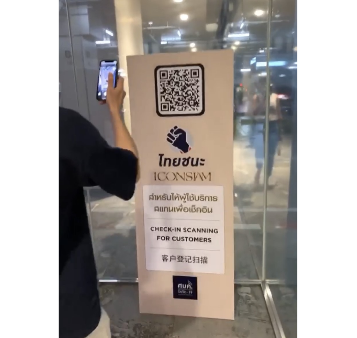 Dee: いまタイではロックダウンが緩められ、ビジネスが再開されました。ただ感染状況をコントロールするために、「タイシャナ」というプロジェクトがスタートしました。政府の施策ですが、モールやレストラン、様々なお店に入る前に、このQRコードをスキャンしないといけません。目的は、誰がどこにいるかという行動記録を取ることと、モールの中の混雑状況を管理するためです。使い方はすごく簡単です。専用アプリは必要なく、スマホでQRコードをスキャンしたら、一回だけスマホの電話番号を入れて終わりです。次回以降はスキャンしてチェックインというボタンを押すだけ。外に出て買い物に行きたい場合、皆必ずこれをやる必要があります。当然デジタルリテラシーも上がり、QRコードにももっと慣れるようになると思います。