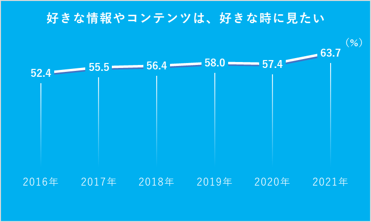 メディア意識・態度63項目の中で、昨年から最も大きく伸びた「好きな情報やコンテンツは、好きな時に見たい」は、初めて6割(63.7%)を超えた(図1)。