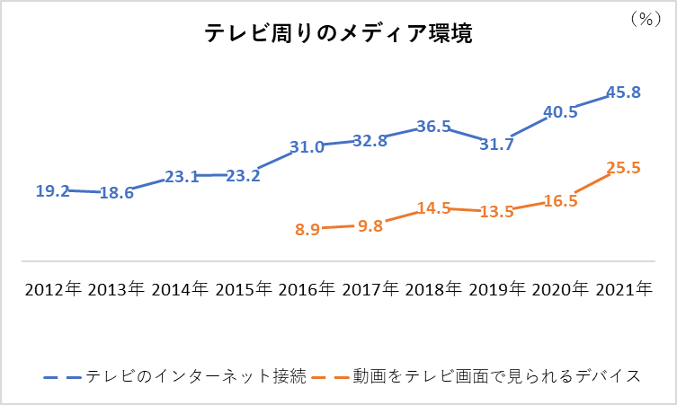 定額制動画配信サービスの利用は急伸し、テレビ番組無料配信サービスである「TVer」の利用も増加(図2)。テレビのインターネット接続や動画をテレビで見るデバイスの所有も伸長した(図3)。